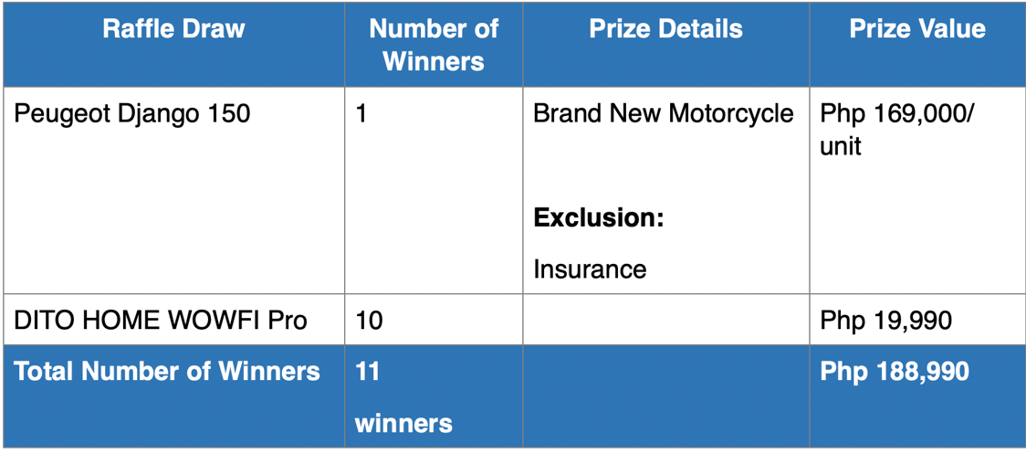- Raffle Draw: The raffle draw will be held on October 2, 2025, at 3:00 PM at the 11th Floor, DITO Telecommunity Corporation Office, in the presence of a DTI representative.