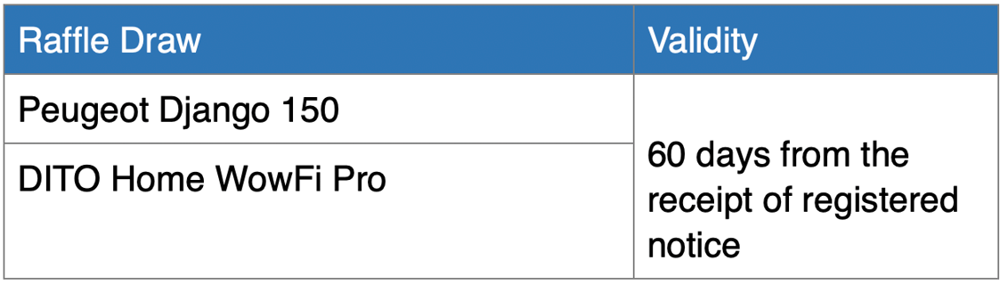 All prize claiming and processing will be handled by DITO’s brand partners. Failure to respond within the claim period will result in forfeiture of the prize, and DITO Telecommunity reserves the right to award it to another winner with prior DTI approval.